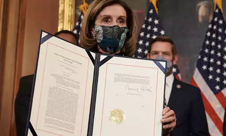 U.S. House Speaker Nancy Pelosi on Wednesday evening signed the enforcement of the article of impeachment against President Donald Trump that her chamber passed earlier in the day.