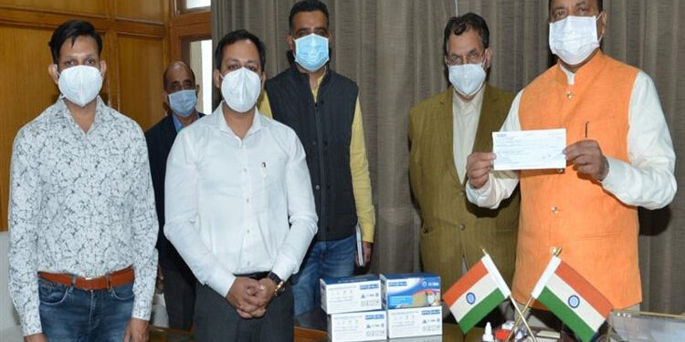 Saurabh Gupta, Amit Sharma and Aman Gupta of Pioneer Impex (Safeshield) Baddi, district Solan presented a cheque of Rs. one lakh to Chief Minister Jai Ram Thakur here today towards Chief Minister Relief Fund besides donating one lakh Safeshield Surgical Masks.