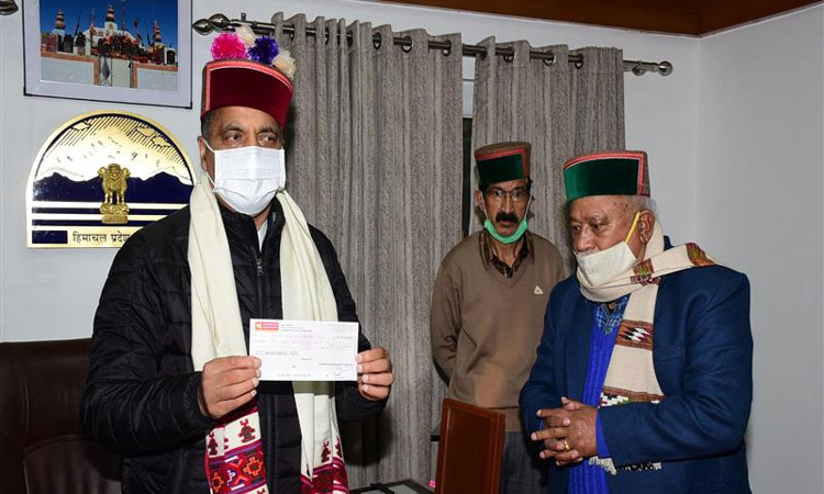Chief Minister Jai Ram Thakur was presented a cheque of rupees one lakh 75 thousand by President Kinnaur Ex-Paramilitary Welfare Association Devender Singh Negi on behalf of the Association, as a contribution towards HPSDMA Covid-19 SDR Fund, here today. Chief Minister thanked the Association for this noble gesture.