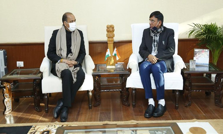 Chief Minister Jairam Thakur with Union Minister of State for Chemicals and Fertilizers Mansukh L Mandaviya at New Delhi.Chief Minister Jai Ram Thakur called on Union Minister of State for Chemicals and Fertilizers Mansukh L Mandaviya at New Delhi late last evening.
